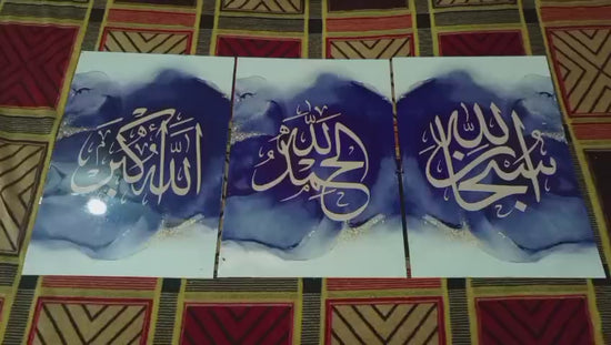 Elevate your home decor with this stunning 3-piece metal Islamic abstract wall art. The blue and golden color palette add a touch of modern elegance, while the motivational message inspires inner peace and positivity. Perfect for any Muslim household seeking a unique and artistic touch to their living space.